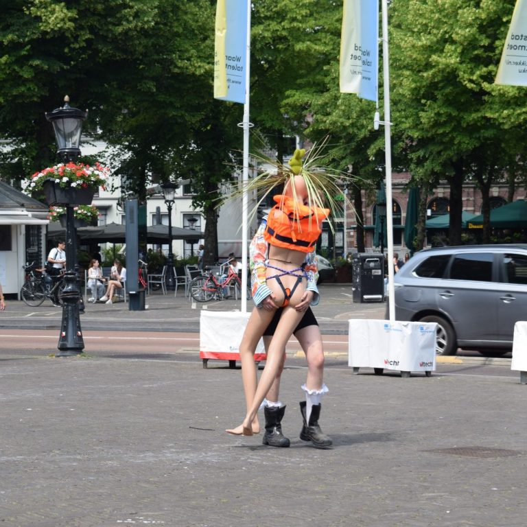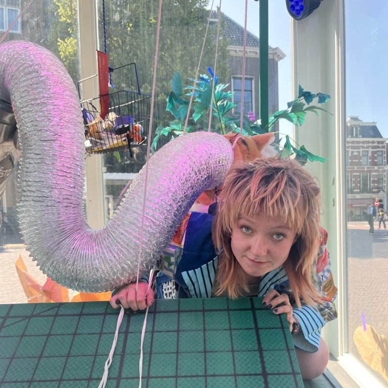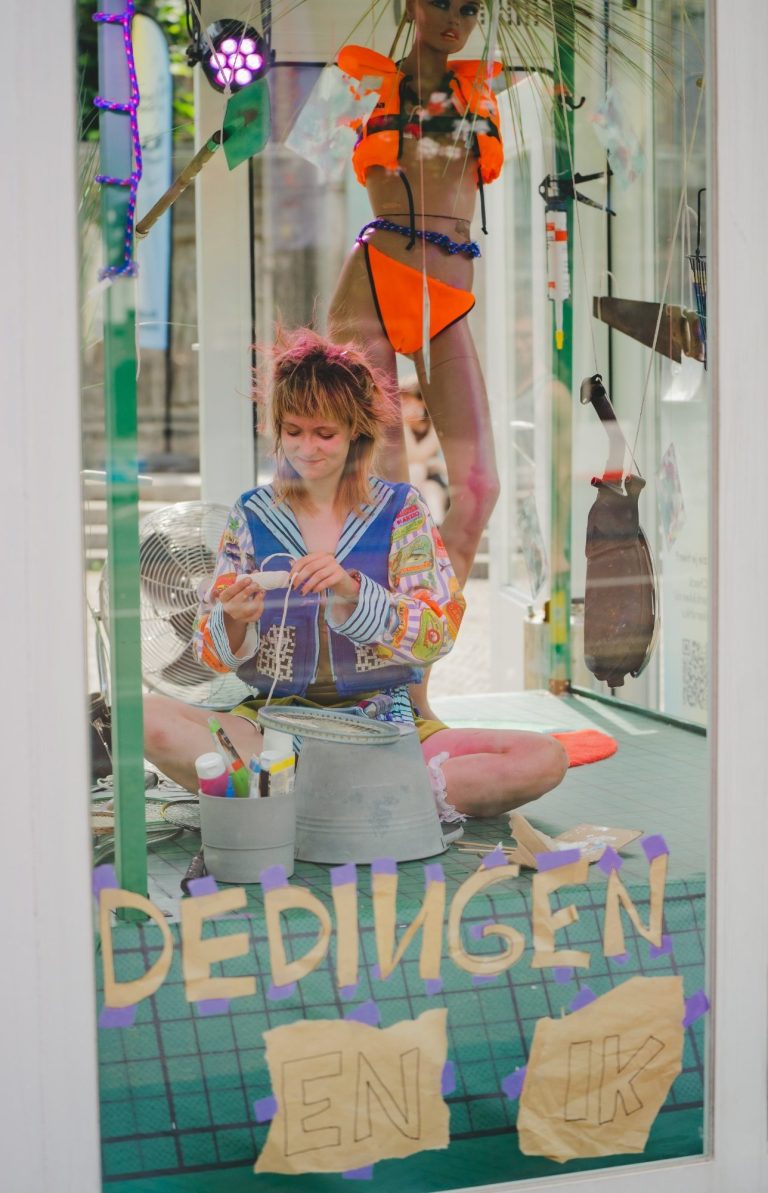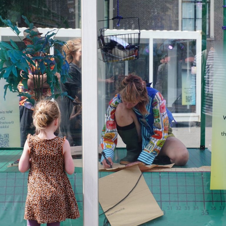 Als laatste stap in mijn onderzoek vroeg ik me af of ik COLLAGE ALS SCRIPT kon inzetten. Of ik vanuit een collage een dramaturgie kon halen. Zo ontstond ‘IK EN DE DINGEN’, mijn performance voor het Kikker Kontainer-project. In een glazen container op het Janskerkhof werkte ik drie dagen op een levensgrote snijmat aan de collages die ik voor dit project had gemaakt.